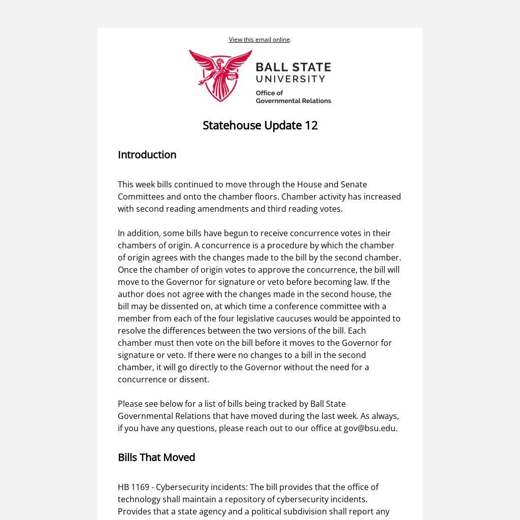 Please see below for a list of bills being tracked by Ball State Governmental Relations that have moved during the last week. As always, if you have any questions, please reach out to our office at gov@bsu.edu.