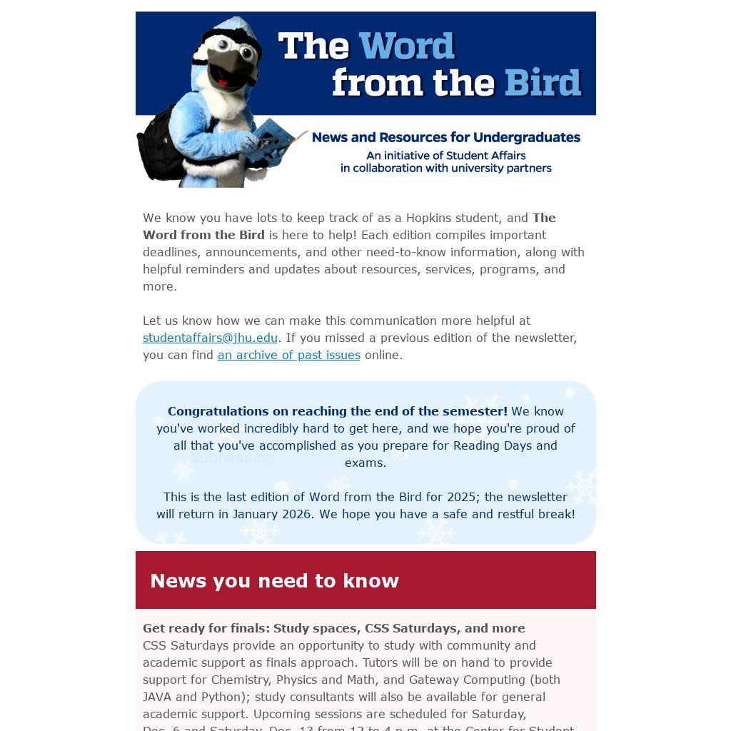 We know you have lots to keep track of as a Hopkins student, and The Word from the Bird is here to help! Each edition compiles important deadlines, announcements, and other need-to-know information, along with helpful reminders and updates about resources, services, programs, and more.