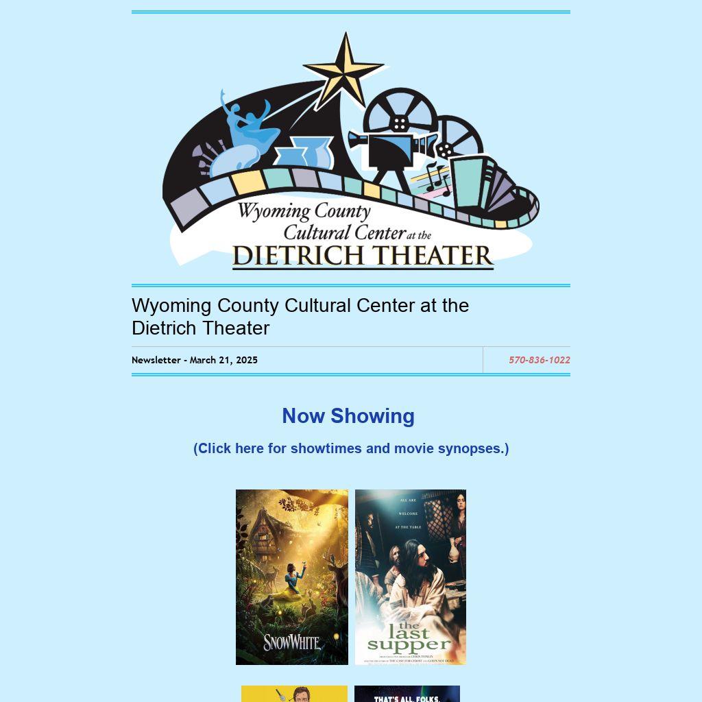 And all Open Mic Night fans will be glad to hear that Open Mic Night season begins Friday, March 28 at 7:00 p.m. and will continue every 4th Friday through October. If you have a talent to share such as music, poetry, comedy, or other talent, arrive at 6:30 to register. The featured performer is Molly Keiser who has starred in 6 musicals at the Tunkhannock Area School District. Admission is free. Viola Henning is the host of Open Mic and will welcome you to the first one of 2025. There is so much more going on at the Wyoming County Cultural Center at the Dietrich Theater. Visit DietrichThetaer.com or pick up at brochure at the theater to learn more about classes, events and movies at the Dietrich.