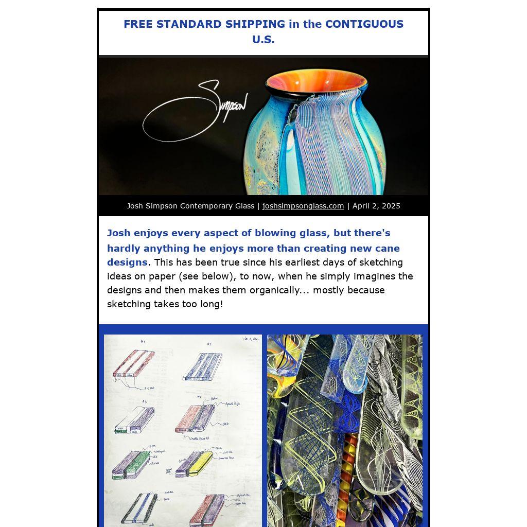Josh enjoys every aspect of blowing glass, but there's hardly anything he enjoys more than creating new cane designs. This has been true since his earliest days of sketching ideas on paper (see below), to now, when he simply imagines the designs and then makes them organically... mostly because sketching takes too long!