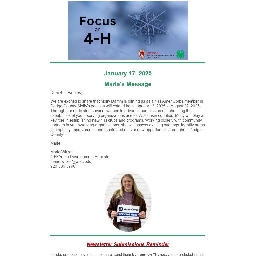We are excited to share that Molly Damm is joining us as a 4-H AmeriCorps member in Dodge County. Molly's position will extend from January 13, 2025 to August 22, 2025. Through her dedicated service, we aim to advance our mission of enhancing the capabilities of youth-serving organizations across Wisconsin counties. Molly will play a key role in establishing new 4-H clubs and programs. Working closely with community partners in youth-serving organizations, she will assess existing offerings, identify areas for capacity improvement, and create and deliver new opportunities throughout Dodge County.