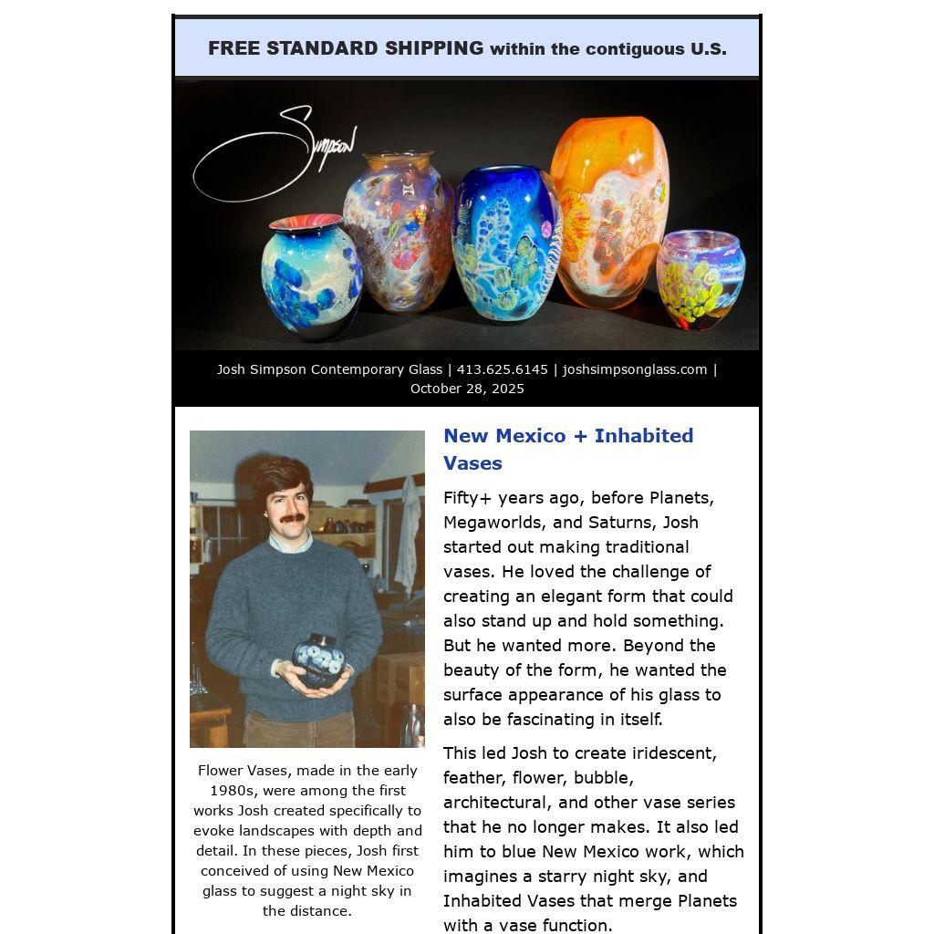 This led Josh to create iridescent, feather, flower, bubble, architectural, and other vase series that he no longer makes. It also led him to blue New Mexico work, which imagines a starry night sky, and Inhabited Vases that merge Planets with a vase function.