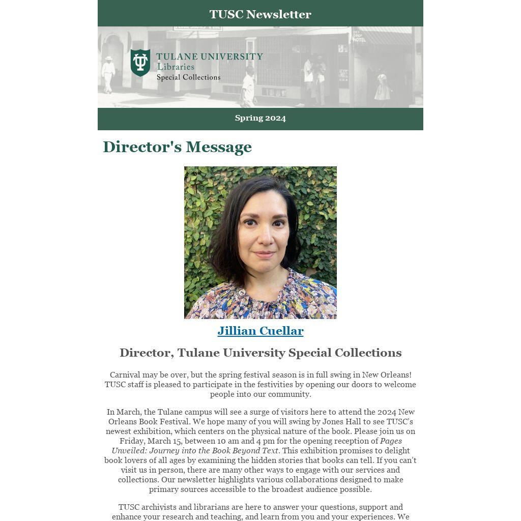 In March, the Tulane campus will see a surge of visitors here to attend the 2024 New Orleans Book Festival. We hope many of you will swing by Jones Hall to see TUSC’s newest exhibition, which centers on the physical nature of the book. Please join us on Friday, March 15, between 10 am and 4 pm for the opening reception of Pages Unveiled: Journey into the Book Beyond Text. This exhibition promises to delight book lovers of all ages by examining the hidden stories that books can tell. If you can’t visit us in person, there are many other ways to engage with our services and collections. Our newsletter highlights various collaborations designed to make primary sources accessible to the broadest audience possible.