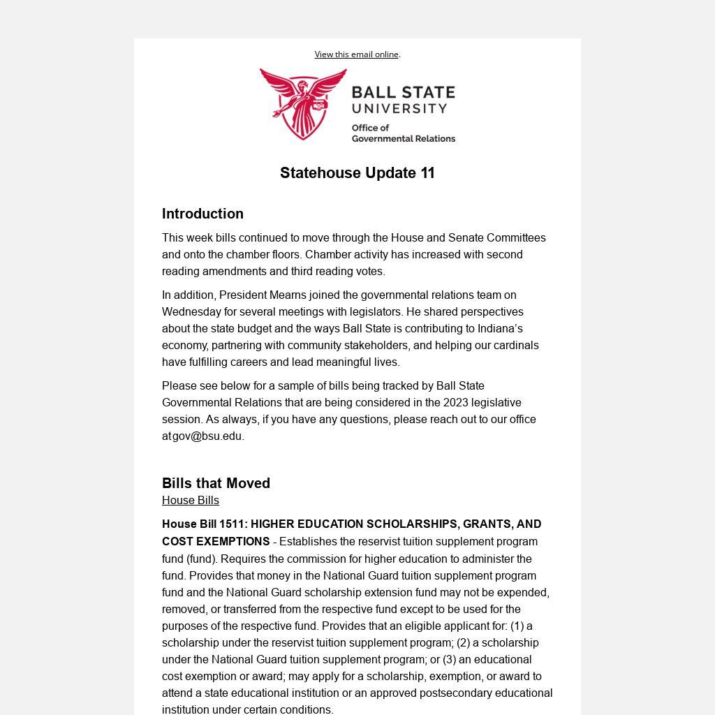 Please see below for a sample of bills being tracked by Ball State Governmental Relations that are being considered in the 2023 legislative session. As always, if you have any questions, please reach out to our office at gov@bsu.edu.