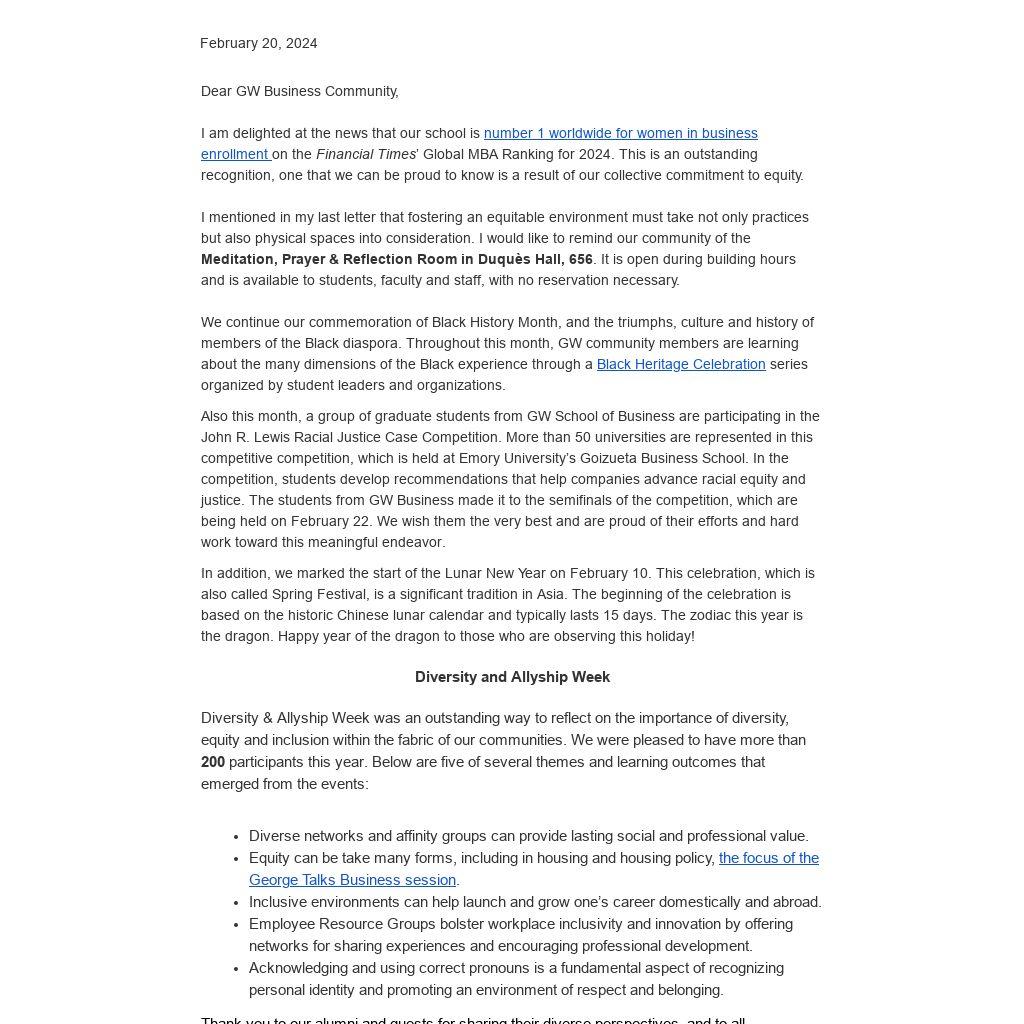 I am delighted at the news that our school is number 1 worldwide for women in business enrollment on the Financial Times’ Global MBA Ranking for 2024. This is an outstanding recognition, one that we can be proud to know is a result of our collective commitment to equity. I mentioned in my last letter that fostering an equitable environment must take not only practices but also physical spaces into consideration. I would like to remind our community of the Meditation, Prayer & Reflection Room in Duquès Hall, 656. It is open during building hours and is available to students, faculty and staff, with no reservation necessary. We continue our commemoration of Black History Month, and the triumphs, culture and history of members of the Black diaspora. Throughout this month, GW community members are learning about the many dimensions of the Black experience through a Black Heritage Celebration series organized by student leaders and organizations.