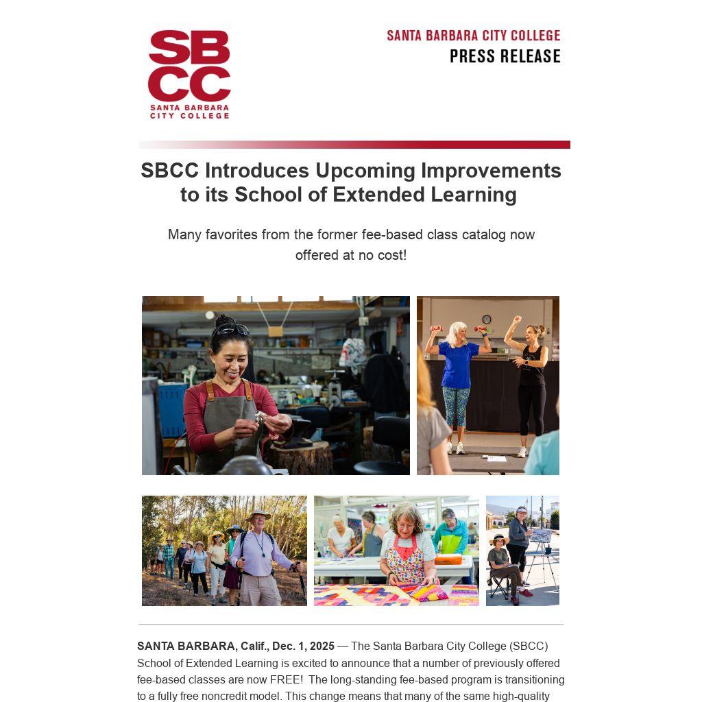 SANTA BARBARA, Calif., Dec. 1, 2025 The Santa Barbara City College (SBCC) School of Extended Learning is excited to announce that a number of previously offered fee-based classes are now FREE!  The long-standing fee-based program is transitioning to a fully free noncredit model. This change means that many of the same high-quality classes students have enjoyed for years will now be available at no cost.