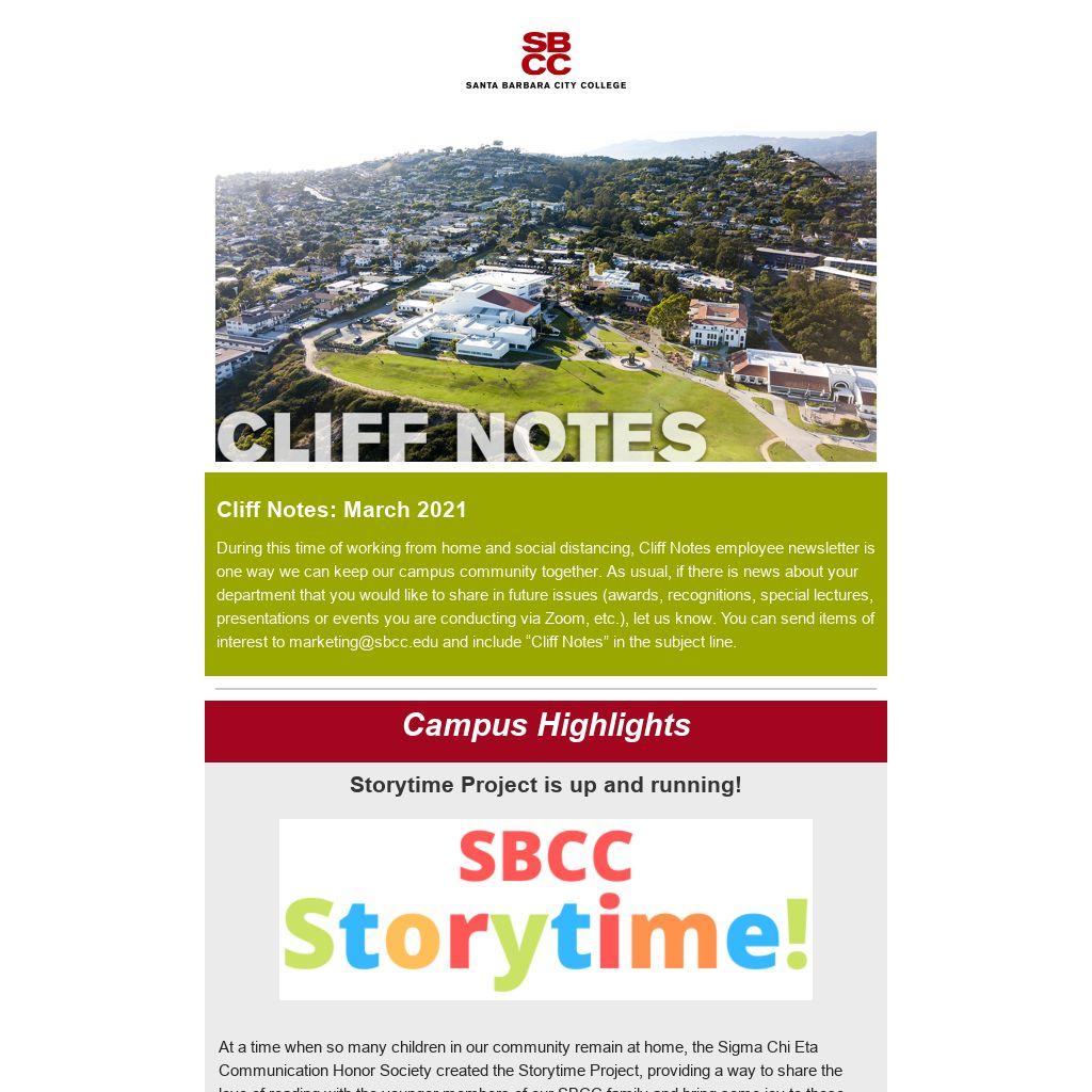 During this time of working from home and social distancing, Cliff Notes employee newsletter is one way we can keep our campus community together. As usual, if there is news about your department that you would like to share in future issues (awards, recognitions, special lectures, presentations or events you are conducting via Zoom, etc.), let us know. You can send items of interest to marketing@sbcc.edu and include “Cliff Notes” in the subject line.