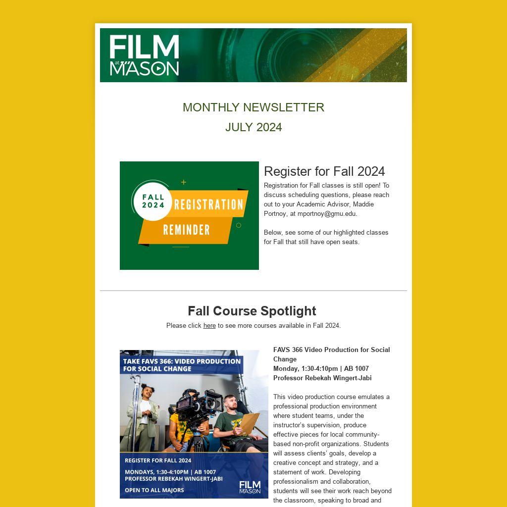We want to hear from you! If you have news you would like to contribute, please send it to film@gmu.edu. We are looking for regional film events and updates from Film at Mason alumni. Keep up-to-date on all the current Film at Mason news at film.gmu.edu.