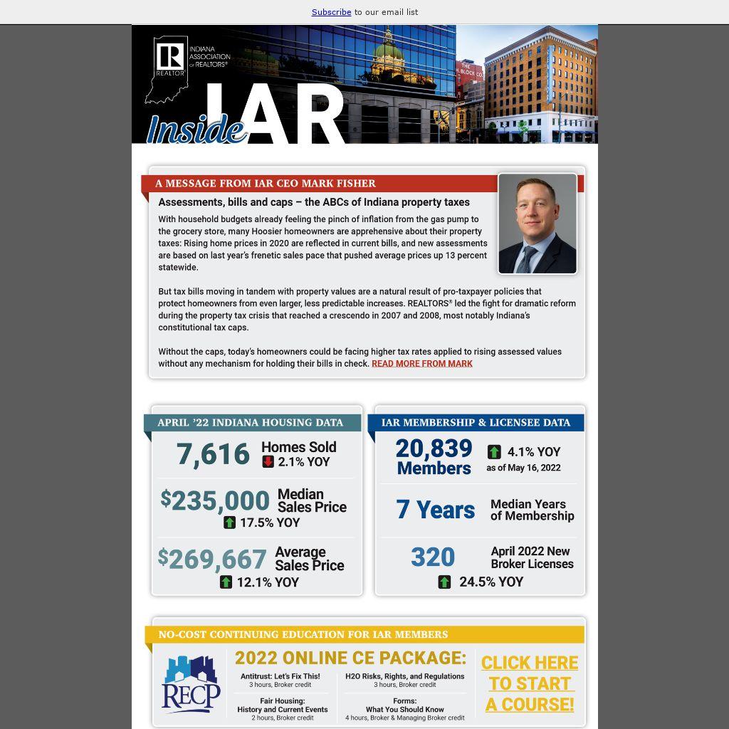 Inside IAR. This monthly newsletter is an activity report from your state association. It’s for our leaders (board members, committee members, past presidents) and the leaders (presidents, presidents-elect) and staff at our local associations. We want to empower you with information and open the lines of communication. The goal is to form more partnerships so the REALTOR® organization is the strongest it can be in Indiana. Thank you for reading and thank you for the time and talent you give to the real estate industry.