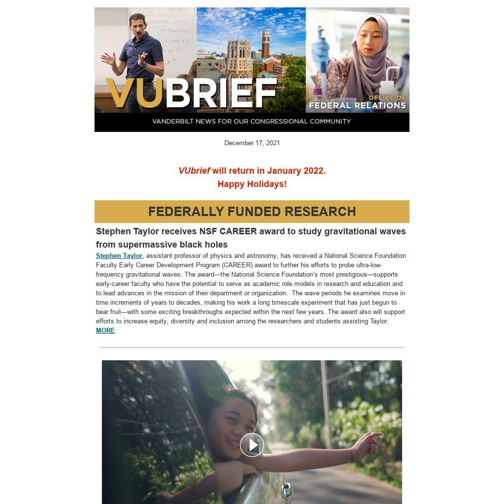 VUbrief summarizes Vanderbilt news items to inform our Congressional community of developments at the university. Visit our website for past issues of VUbrief. Vanderbilt University Office of Federal Relations (202) 216-4361