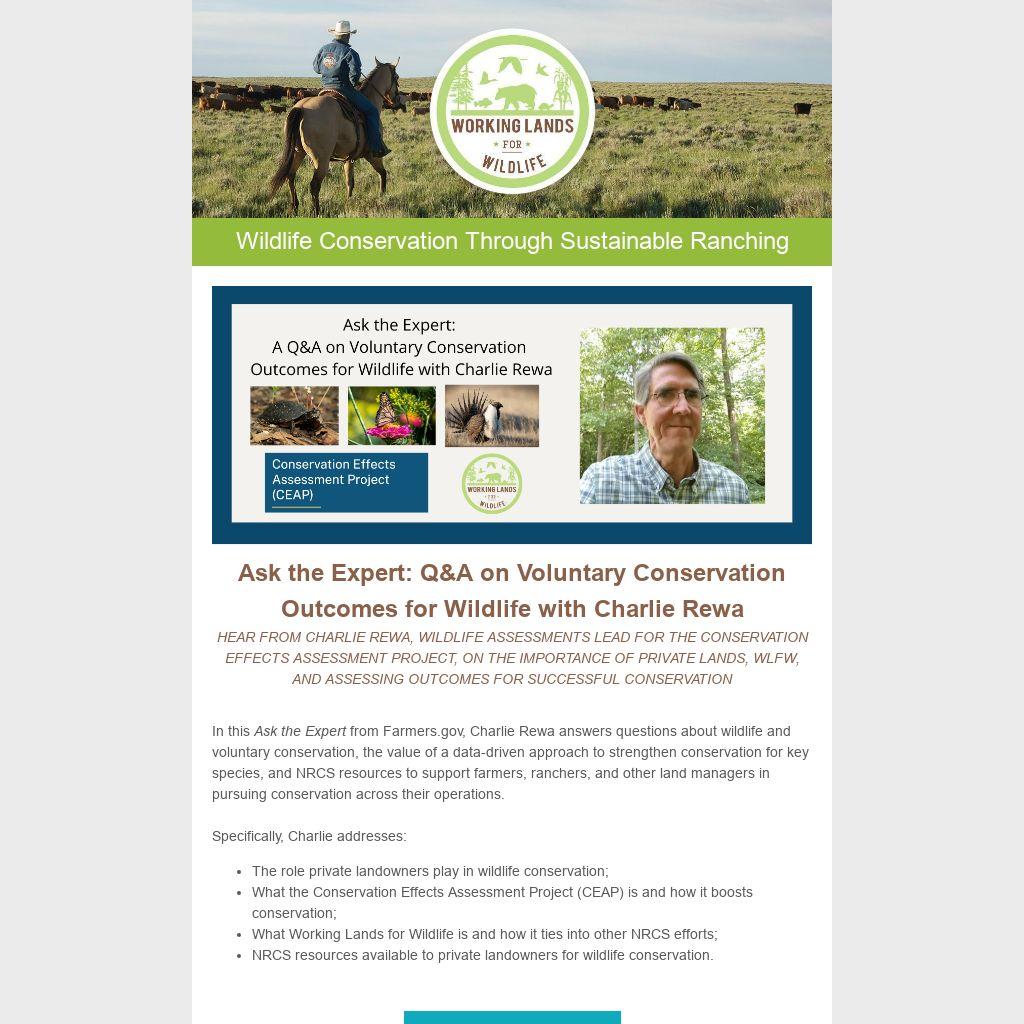 In this Ask the Expert from Farmers.gov, Charlie Rewa answers questions about wildlife and voluntary conservation, the value of a data-driven approach to strengthen conservation for key species, and NRCS resources to support farmers, ranchers, and other land managers in pursuing conservation across their operations.