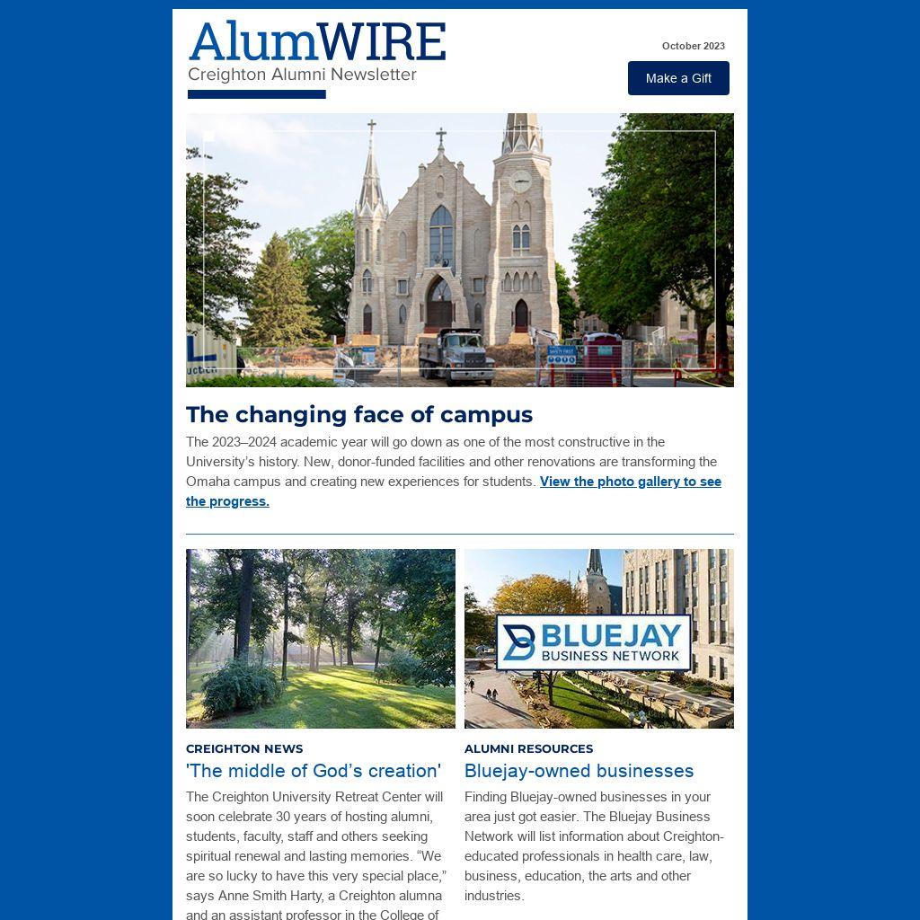 With Thanksgiving coming up, we’re gathering messages of gratitude from alumni, friends, faculty, staff and students. We want to know: What are you most thankful for when it comes to Creighton? Send your response to micahmertes@creighton.edu, and we might include it in our upcoming story.