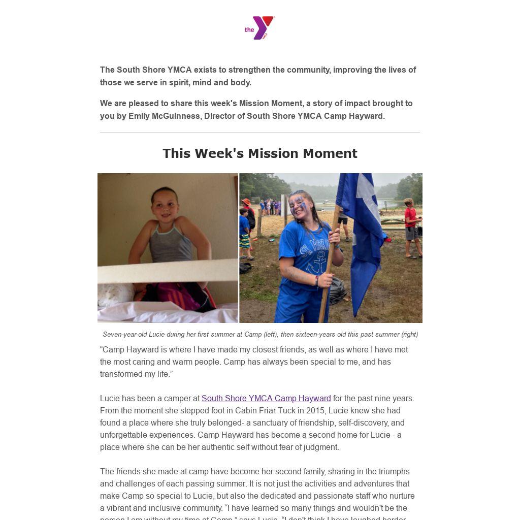 Lucie has been a camper at South Shore YMCA Camp Hayward for the past nine years. From the moment she stepped foot in Cabin Friar Tuck in 2015, Lucie knew she had found a place where she truly belonged- a sanctuary of friendship, self-discovery, and unforgettable experiences. Camp Hayward has become a second home for Lucie - a place where she can be her authentic self without fear of judgment.