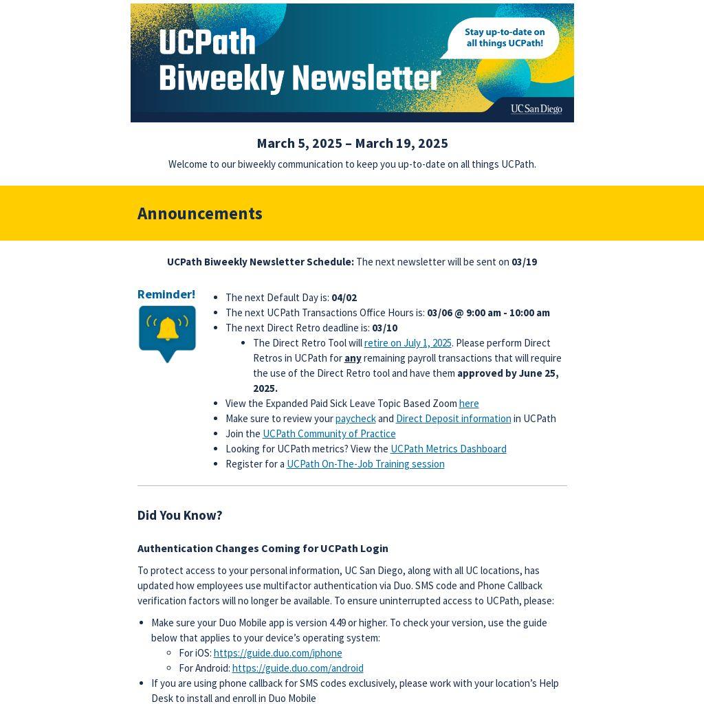 UCPath Biweekly Newsletter Schedule: The next newsletter will be sent on 03/19 |
