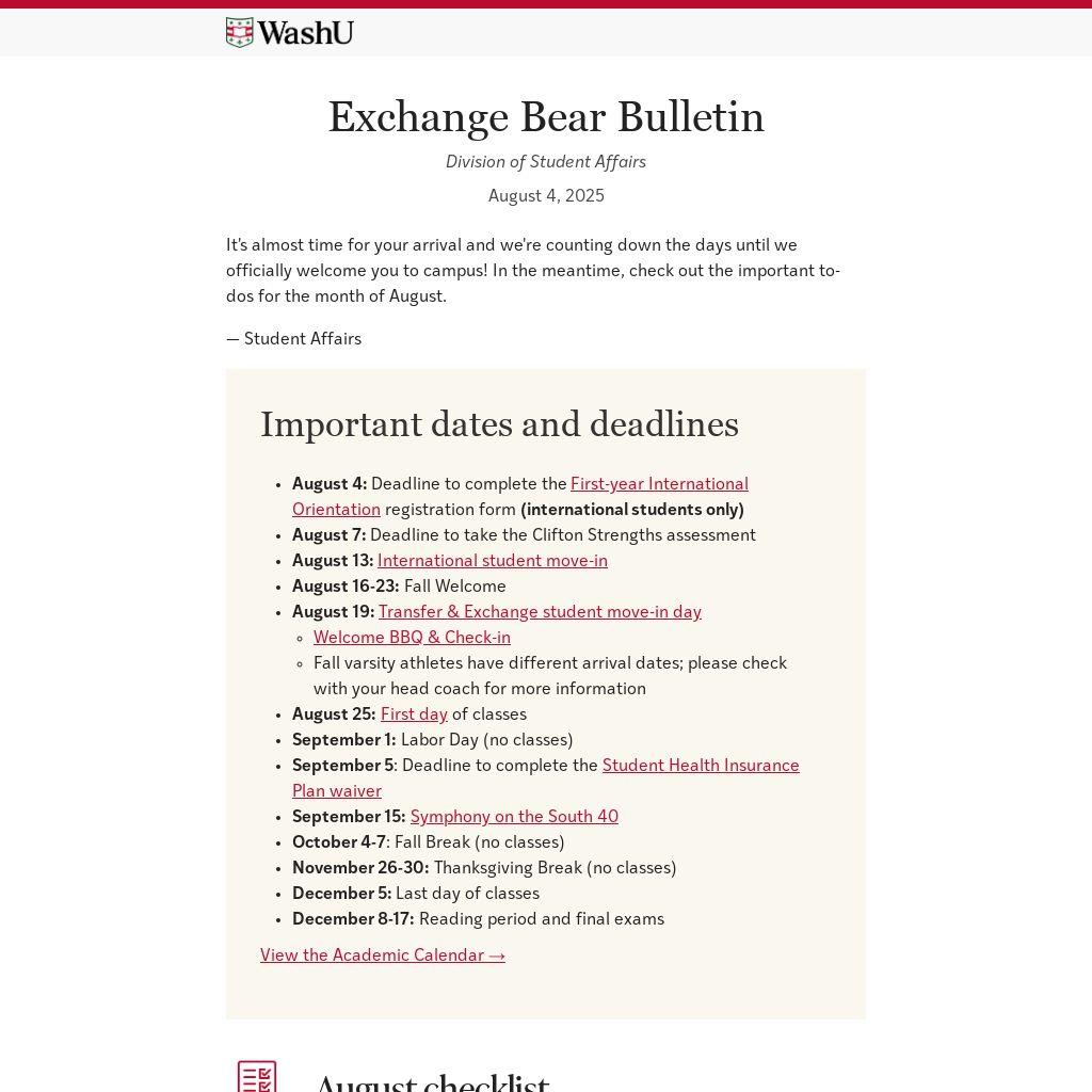 * Move-In Day for international students attending WashU on a visa is Tuesday, August 19. Fall varsity athletes have different arrival dates; please check with your head coach for more information.