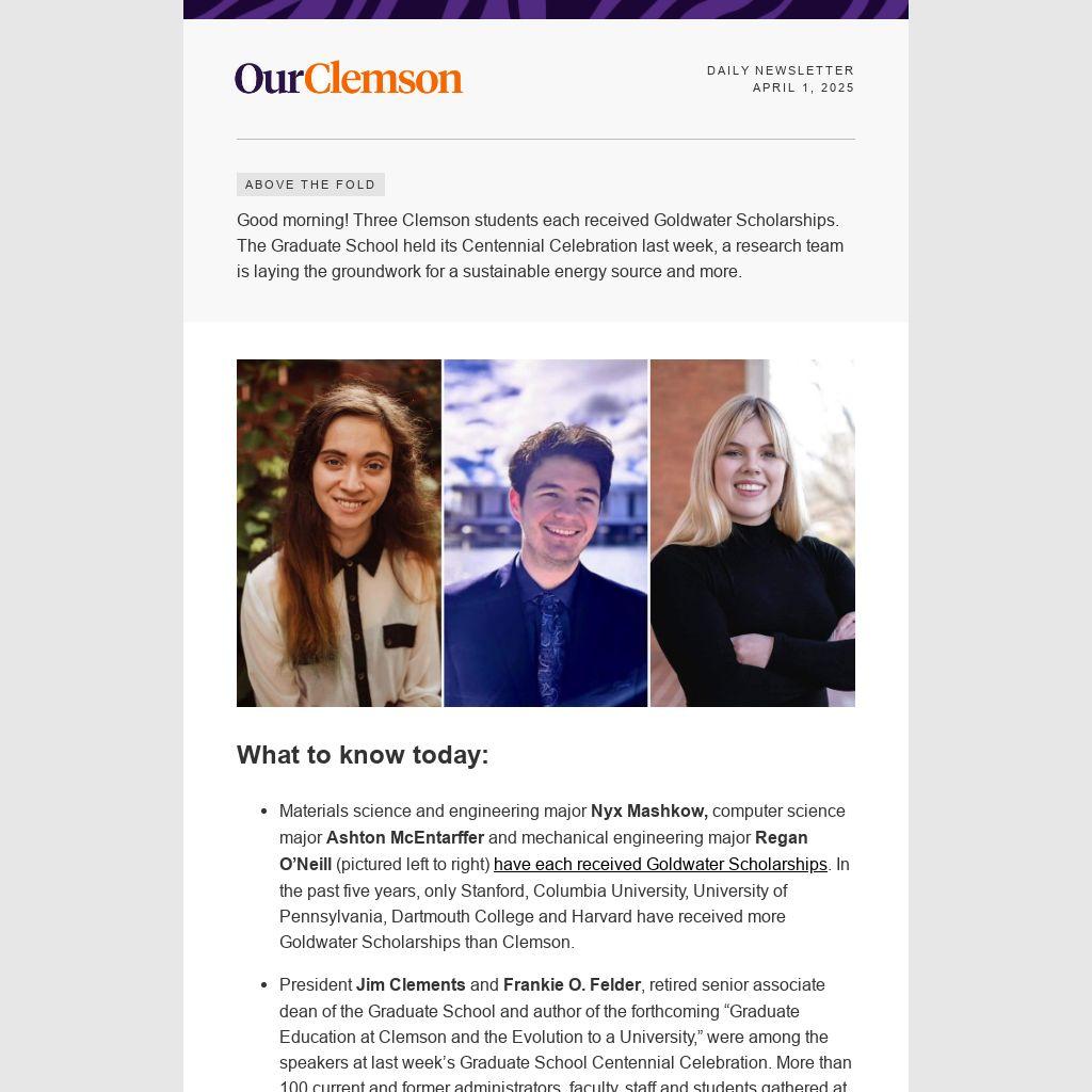 Good morning! Three Clemson students each received Goldwater Scholarships. The Graduate School held its Centennial Celebration last week, a research team is laying the groundwork for a sustainable energy source and more.