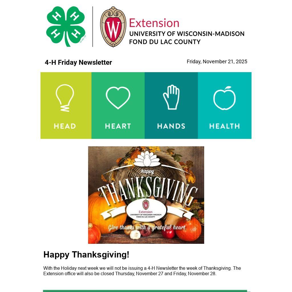With the Holiday next week we will not be issuing a 4-H Newsletter the week of Thanksgiving. The Extension office will also be closed Thursday, November 27 and Friday, November 28.