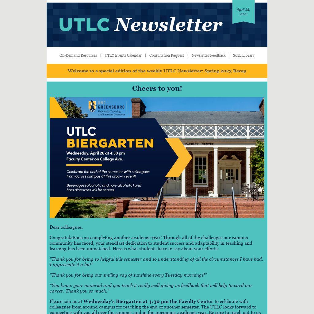 Please join us at Wednesday's Biergarten at 4:30 pm the Faculty Center to celebrate with colleagues from around campus for reaching the end of another semester. The UTLC looks forward to connecting with you all over the summer and in the upcoming academic year. Be sure to reach out to us anytime at utlc@uncg.edu to let us know how our team can support you in any way.