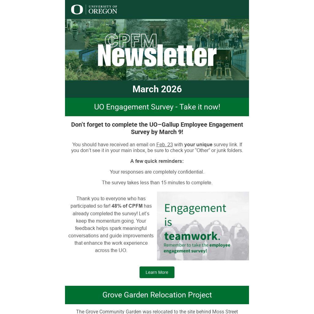 Thank you to everyone who has participated so far! 48% of CPFM has already completed the survey! Let’s keep the momentum going. Your feedback helps spark meaningful conversations and guide improvements that enhance the work experience across the UO.