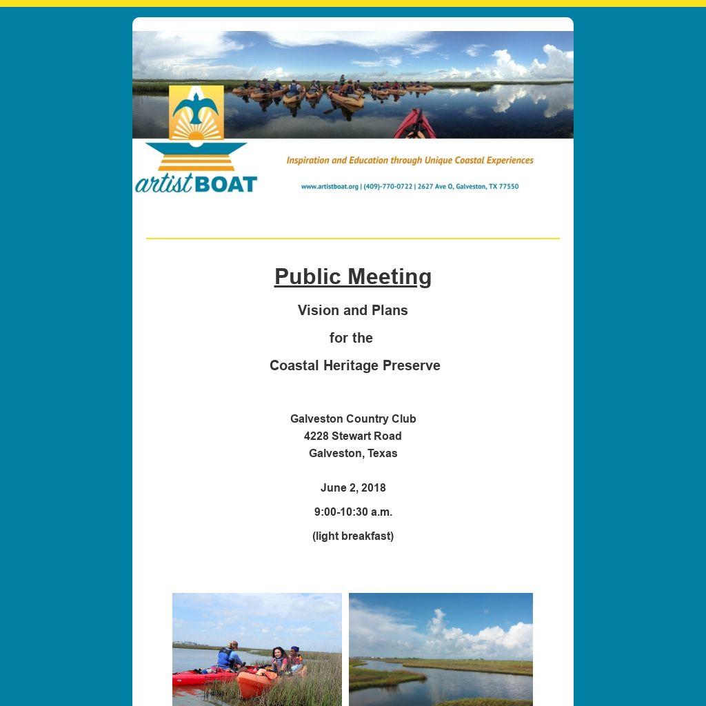 Artist Boat cordially invites all interested parties to join us as we share the full vision for the Coastal Heritage Preserve and future of the Gulf Coast Educational Center. Artist Boat will present the public education and access plan, habitat management plan, and accomplishments to date of the Coastal Heritage Preserve. Learn more about the status of the remaining acreage of Marquette and Anchor Bay still at stake for future development.