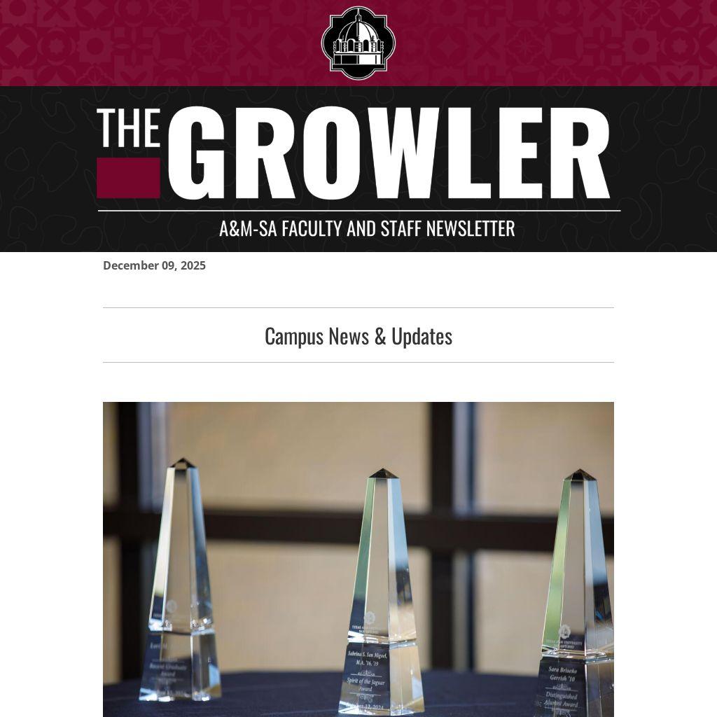 The Growler is the campus newsletter for faculty and staff of Texas A&M-San Antonio. The Growler is published every Tuesday from the start of the semester, providing insight into A&M-SA news, events, and announcements. If you would like to promote a University-wide event or announcement in The Growler, submit this form by 5 p.m. CT on a Monday the week before publication.