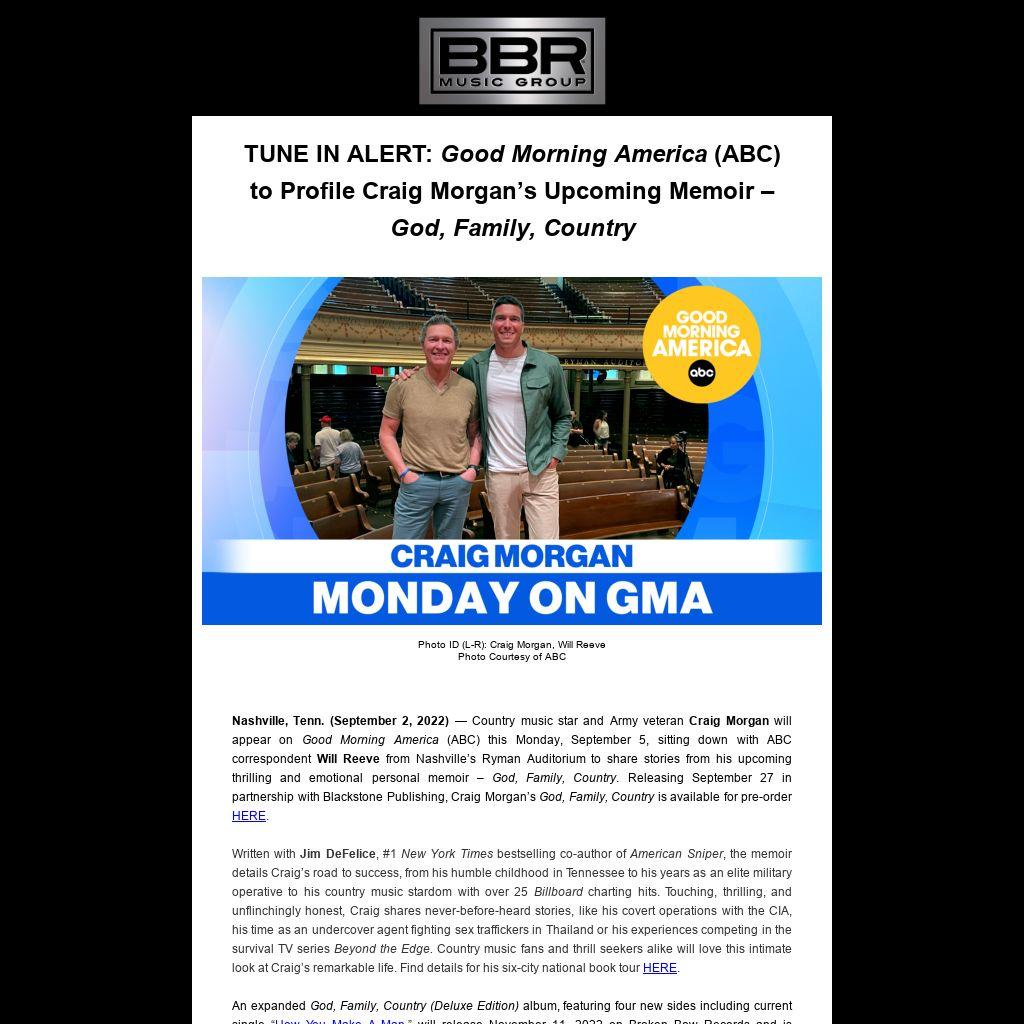 TUNE IN ALERT: Good Morning America (ABC) to Profile Craig Morgan’s Upcoming Memoir – God, Family, Country