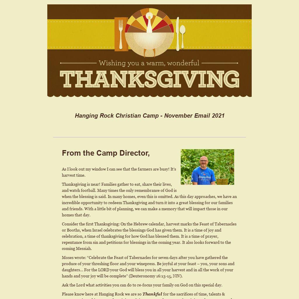 Please know here at Hanging Rock we are so Thankful for the sacrifices of time, talents & treasures given this year to the ministry. It is so great to be a part of a ministry that many people are so passionate about and are willing to support! We are so thankful for your partnership. We give thanks for you! We hope you have a great Thanksgiving!
