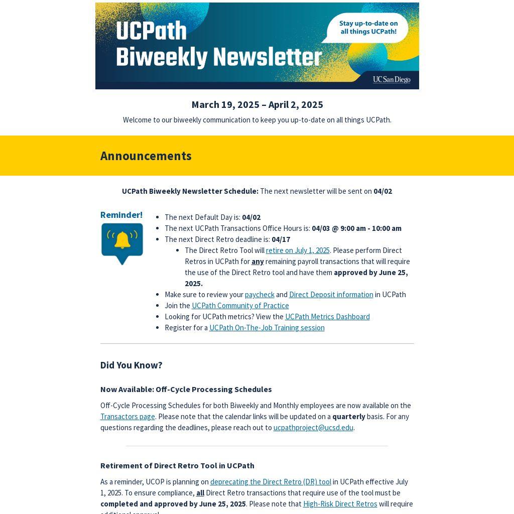 UCPath Biweekly Newsletter Schedule: The next newsletter will be sent on 04/02 |