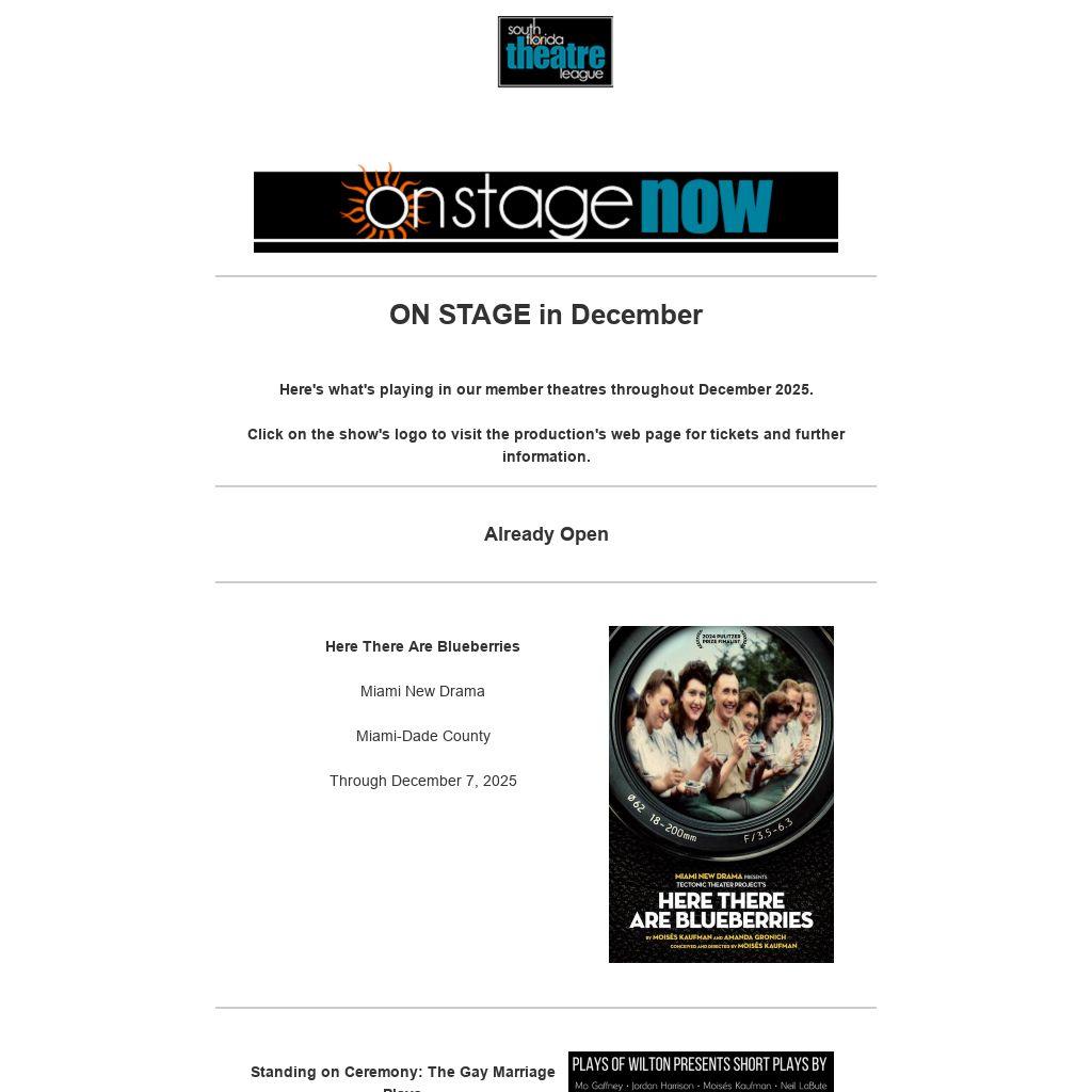 This email blast and other programs of the South Florida Theatre League are made possible with the support of Miami-Dade County Department of Cultural Affairs and the Cultural Affairs Council, the Miami-Dade County Mayor and Board of County Commissioners.