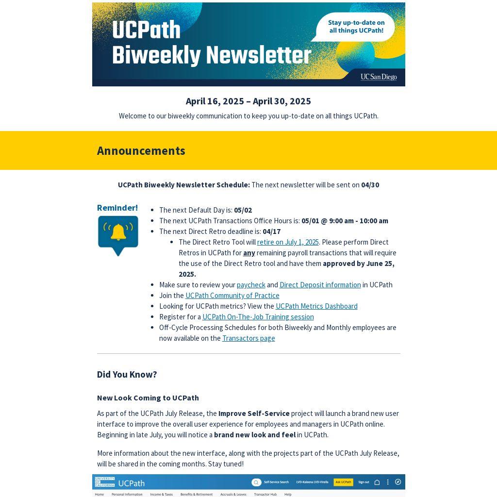 UCPath Biweekly Newsletter Schedule: The next newsletter will be sent on 04/30 |