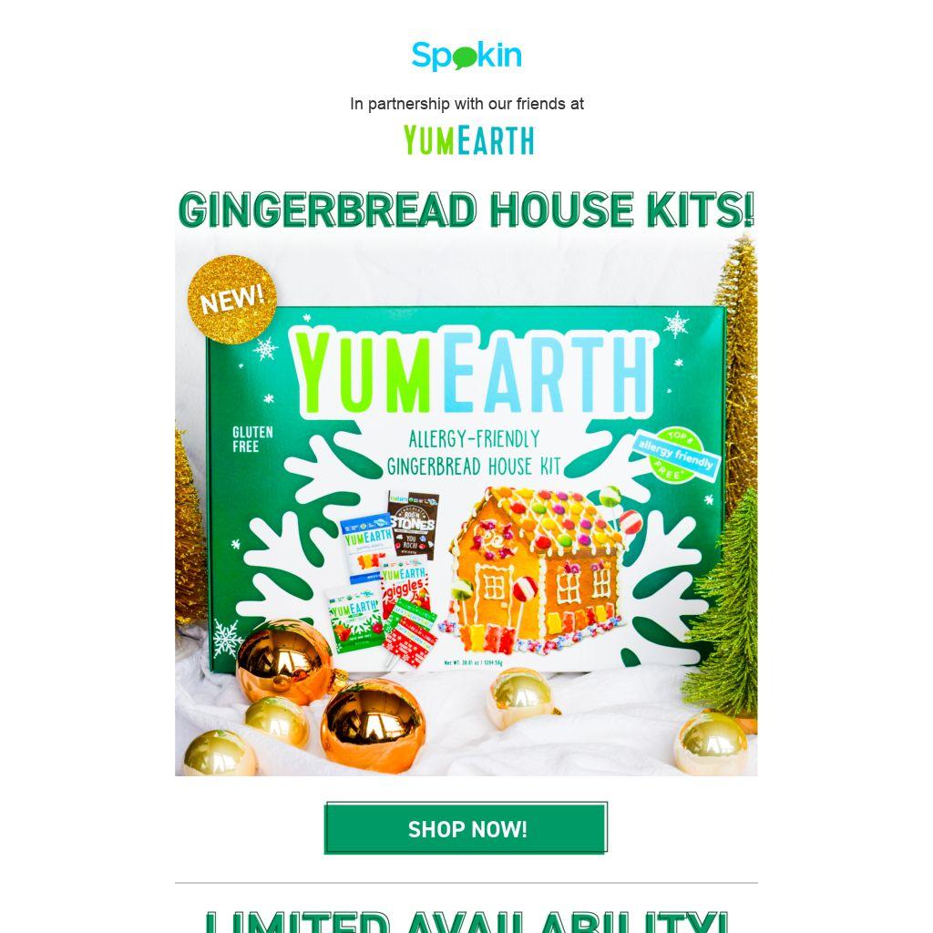 NEW from YumEarth: Allergy-Friendly Gingerbread House Kits available in a limited supply! Start a sweet new tradition with YumEarth's top 9 and gluten-free kit. Each kit comes with a gingerbread house, icing, and YumEarth candy to decorate with including Candy Cane Pops, Giggles, Gummy Bears, Chocolate Roll’n Stones, and Gummy Fruits. Find YumEarth's product information, facility details, and their Verified Brand Allergen FAQ on the Spokin app.