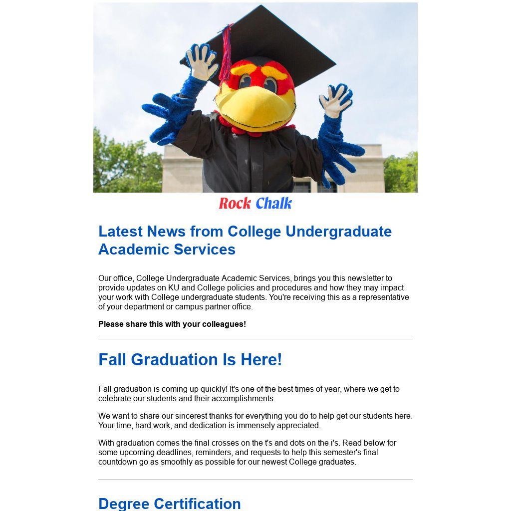 Our office, College Undergraduate Academic Services, brings you this newsletter to provide updates on KU and College policies and procedures and how they may impact your work with College undergraduate students. You're receiving this as a representative of your department or campus partner office.