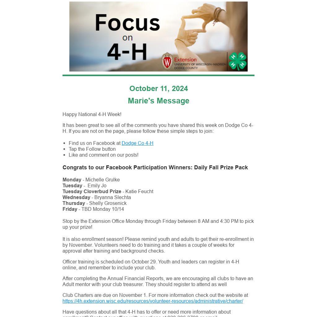 Club Charters are due on November 1. For more information check out the website at https://4h.extension.wisc.edu/resources/volunteer-resources/administrative/charter/
