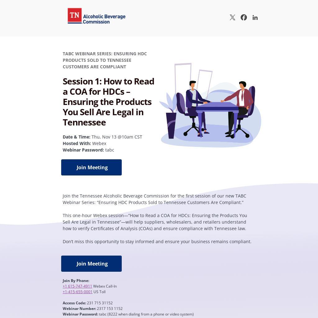 Join the Tennessee Alcoholic Beverage Commission for the first session of our new TABC Webinar Series: “Ensuring HDC Products Sold to Tennessee Customers Are Compliant.”