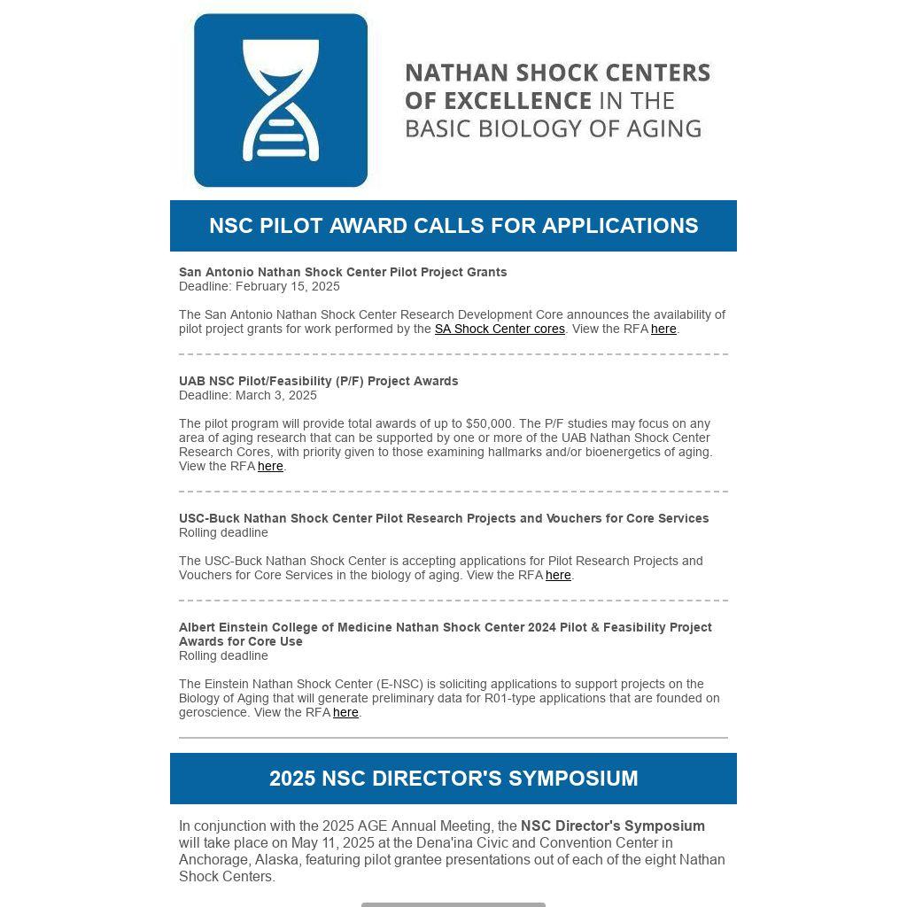 In conjunction with the 2025 AGE Annual Meeting, the NSC Director's Symposium will take place on May 11, 2025 at the Dena'ina Civic and Convention Center in Anchorage, Alaska, featuring pilot grantee presentations out of each of the eight Nathan Shock Centers.