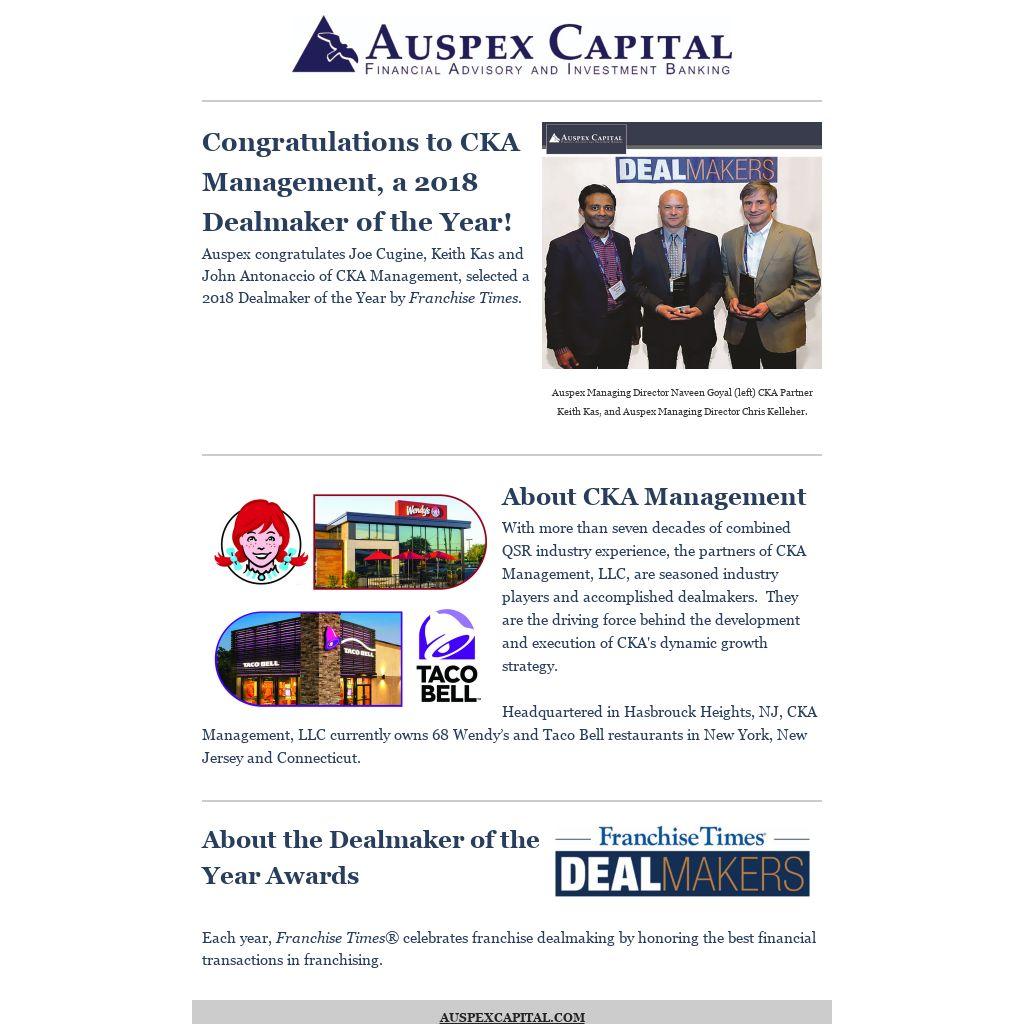 With more than seven decades of combined QSR industry experience, the partners of CKA Management, LLC, are seasoned industry players and accomplished dealmakers. They are the driving force behind the development and execution of CKA's dynamic growth strategy.