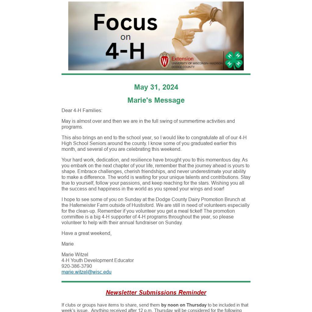 This also brings an end to the school year, so I would like to congratulate all of our 4-H High School Seniors around the county. I know some of you graduated earlier this month, and several of you are celebrating this weekend.