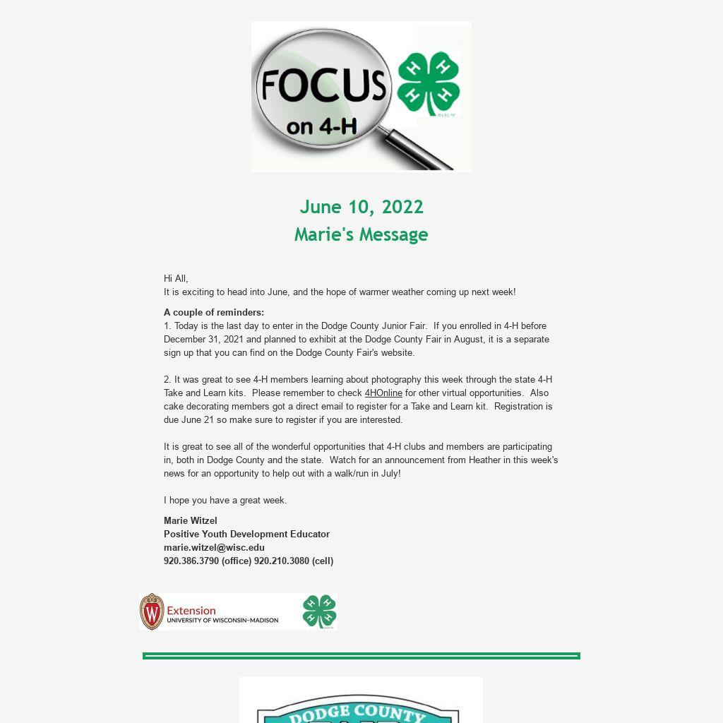It is great to see all of the wonderful opportunities that 4-H clubs and members are participating in, both in Dodge County and the state. Watch for an announcement from Heather in this week's news for an opportunity to help out with a walk/run in July!