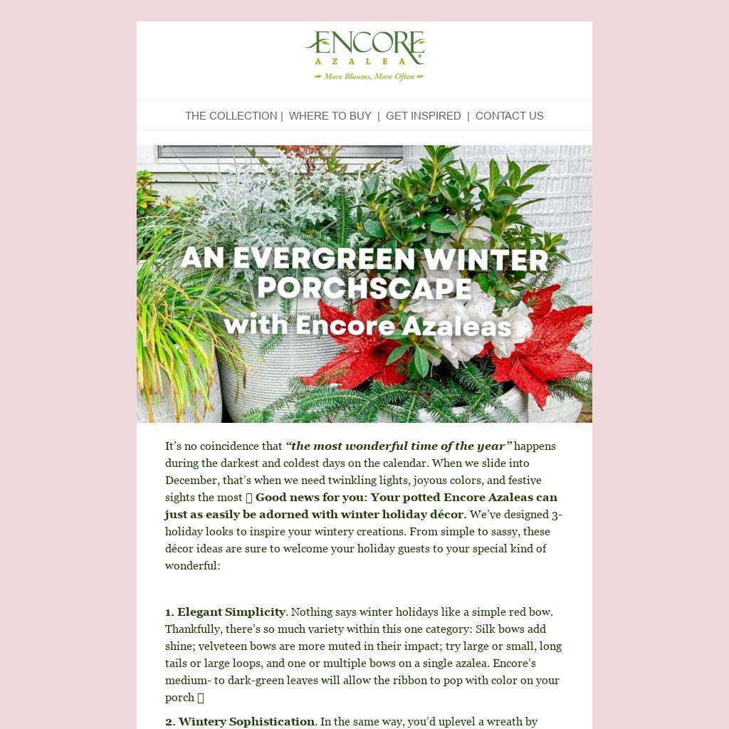 1. Elegant Simplicity. Nothing says winter holidays like a simple red bow. Thankfully, there’s so much variety within this one category: Silk bows add shine; velveteen bows are more muted in their impact; try large or small, long tails or large loops, and one or multiple bows on a single azalea. Encore’s medium- to dark-green leaves will allow the ribbon to pop with color on your porch 🎁