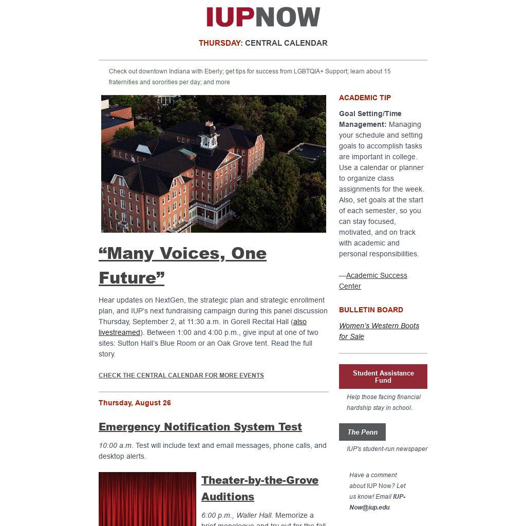 Distributed to IUP employees and students three days a week, IUP Now is the official newsletter of Indiana University of Pennsylvania. It features news from across the IUP website, compiled by the Division of Marketing and Communications. Find out how to get your news and events in IUP Now.