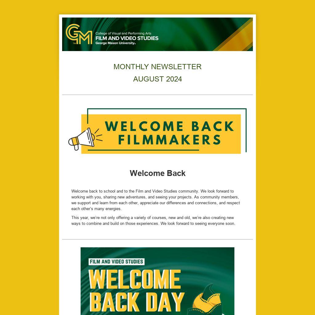 Welcome Back Day is scheduled for Friday, September 6th. At 11:30am, join us in the JC Cinema for the Film Majors Town Hall, an information session where we'll discuss production guidelines, set safety, and important curriculum updates. Come check out the free FAVS swag.