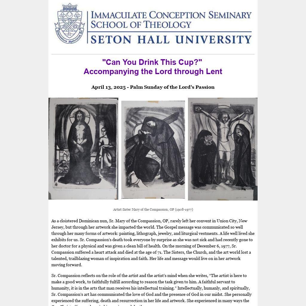 We have chosen three pieces from Sr. Compassion’s series on the Stations of the Cross: Jesus before Pontius Pilate, Veronica Wipes the Face of Jesus, and the Crucifixion. All three pieces are displayed in the administration wing of Immaculate Conception Seminary School of Theology here at Seton Hall University. These pieces represent so well the events we experience in the liturgical actions of Holy Week, from Holy Thursday to Good Friday and Holy Saturday, that gear us up to celebrate Jesus’ Resurrection at Easter. May these images speak to us of the meaning of Holy Week, the central aspects of our faith as Christians, and a reminder to us of why we too are asked to Drink of the Cup Christ gives us.