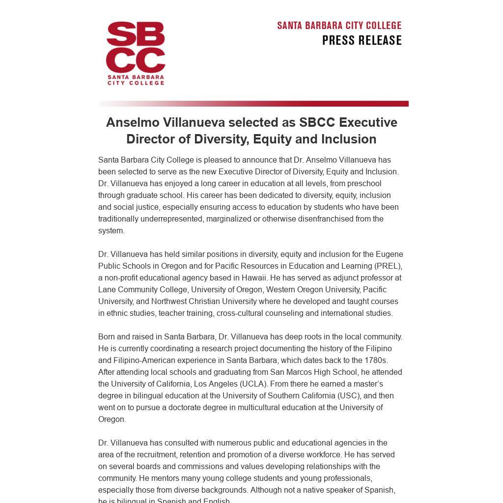 Santa Barbara City College is pleased to announce that Dr. Anselmo Villanueva has been selected to serve as the new Executive Director of Diversity, Equity and Inclusion. Dr. Villanueva has enjoyed a long career in education at all levels, from preschool through graduate school. His career has been dedicated to diversity, equity, inclusion and social justice, especially ensuring access to education by students who have been traditionally underrepresented, marginalized or otherwise disenfranchised from the system.