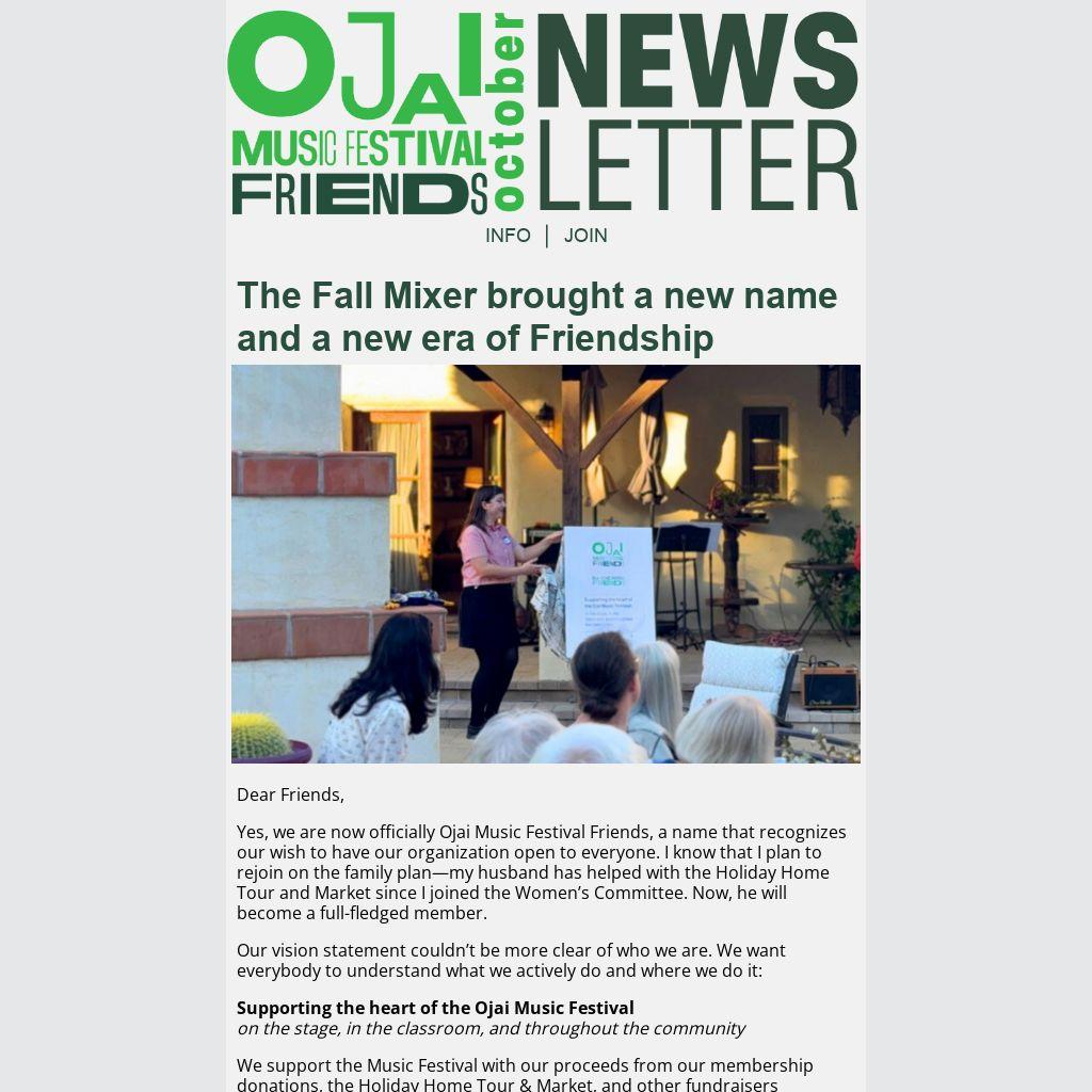 Yes, we are now officially Ojai Music Festival Friends, a name that recognizes our wish to have our organization open to everyone. I know that I plan to rejoin on the family plan—my husband has helped with the Holiday Home Tour and Market since I joined the Women’s Committee. Now, he will become a full-fledged member.
