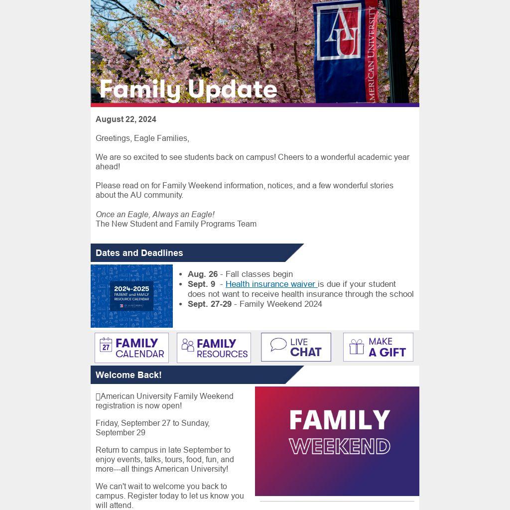 Please read on for Family Weekend information, notices, and a few wonderful stories about the AU community.