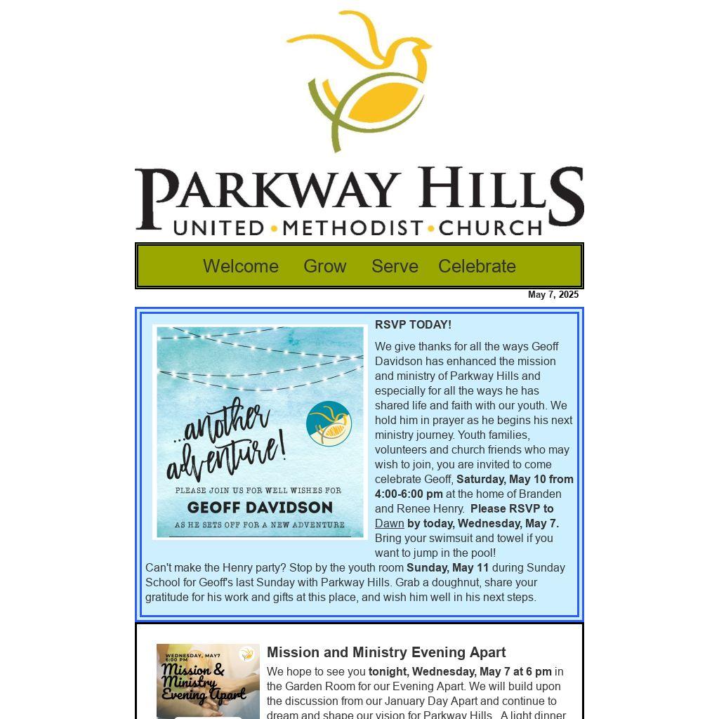 We give thanks for all the ways Geoff Davidson has enhanced the mission and ministry of Parkway Hills and especially for all the ways he has shared life and faith with our youth. We hold him in prayer as he begins his next ministry journey. Youth families, volunteers and church friends who may wish to join, you are invited to come celebrate Geoff, Saturday, May 10 from 4:00-6:00 pm at the home of Branden and Renee Henry. Please RSVP to Dawn by today, Wednesday, May 7. Bring your swimsuit and towel if you want to jump in the pool!