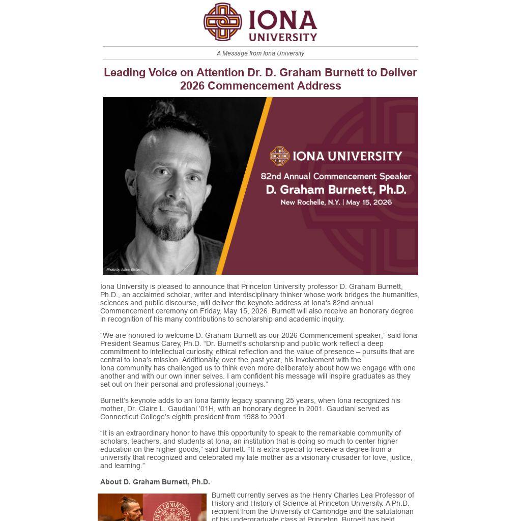 Iona University is pleased to announce that Princeton University professor D. Graham Burnett, Ph.D., an acclaimed scholar, writer and interdisciplinary thinker whose work bridges the humanities, sciences and public discourse, will deliver the keynote address at Iona's 82nd annual Commencement ceremony on Friday, May 15, 2026. Burnett will also receive an honorary degree in recognition of his many contributions to scholarship and academic inquiry.