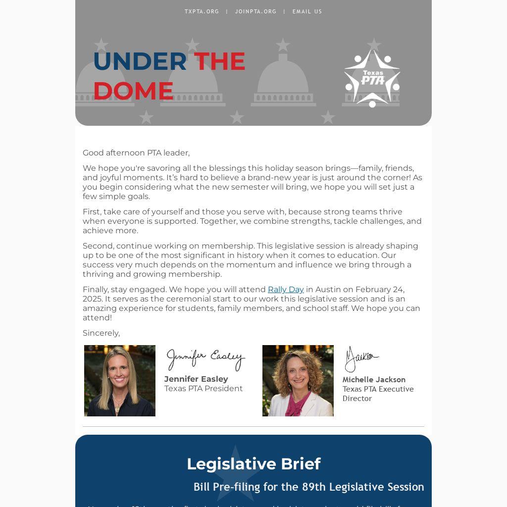 Finally, stay engaged. We hope you will attend Rally Day in Austin on February 24, 2025. It serves as the ceremonial start to our work this legislative session and is an amazing experience for students, family members, and school staff. We hope you can attend!
