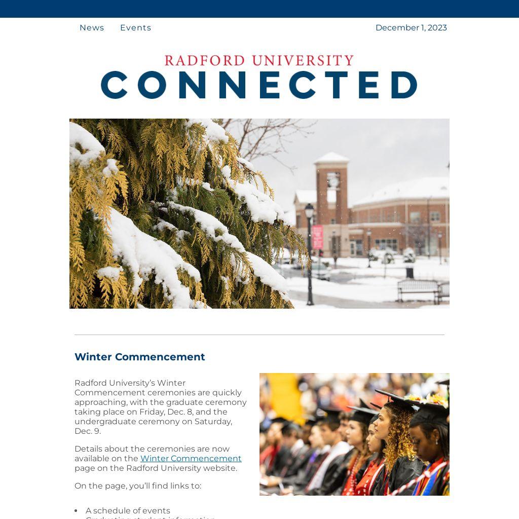 Radford University’s Winter Commencement ceremonies are quickly approaching, with the graduate ceremony taking place on Friday, Dec. 8, and the undergraduate ceremony on Saturday,