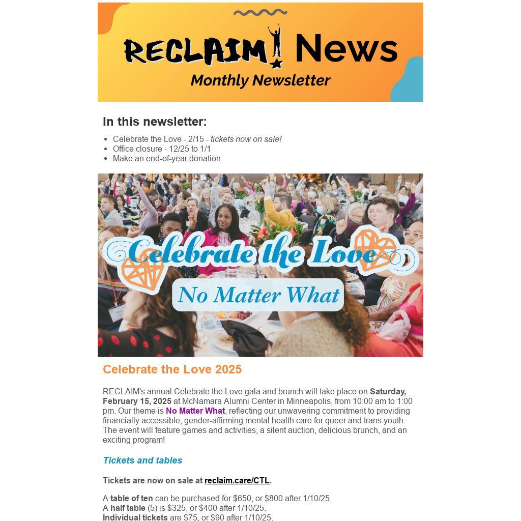 RECLAIM's annual Celebrate the Love gala and brunch will take place on Saturday, February 15, 2025 at McNamara Alumni Center in Minneapolis, from 10:00 am to 1:00 pm. Our theme is No Matter What, reflecting our unwavering commitment to providing financially accessible, gender-affirming mental health care for queer and trans youth. The event will feature games and activities, a silent auction, delicious brunch, and an exciting program!